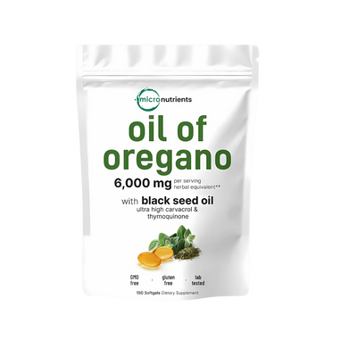 Cada porción aporta 6000 mg de aceite de orégano (extracto 20:1) con 165 mg de carvacrol natural, más 200 mg de aceite de semilla negra para obtener mayores beneficios.